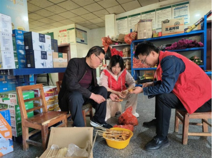 客户经理志愿者帮助客户串豆干、摆货架。吕露摄